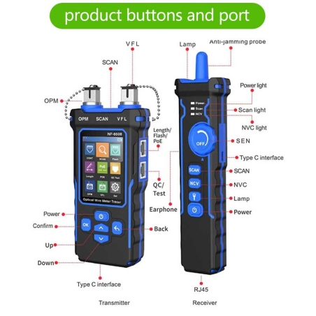 ۱. Testing open circuit, short, cross, and split pair for RJ۴۵ cable. ۲. Two scan modes select-able: Normal Mode/ Anti-jamming Mode. (The sensitivity can be adjusted.) ۳. Port Blink Function: For locating network port by the flashing port light on Hub/Switch. ۴. Measure CAT۵, CAT۶ cable length accurately , the range is ۲.۵m~۲۰۰m. ۵. POE Function: It can test the information of standard POE device, such as POE voltage, power supply polarity, power supply mode and also the type of PSE (af or at standard). ۶. QC Testing for Crystal Head: Plug and unplug the cable that needs to be tested, and the results are updated automatically. A tick indicates that the channel is normal, and a cross indicates that the channel is . ۷. Optical Power Meter Function: (۱) Available Unit: dBm, dB, or mw, uw, nw (۲) Available Wavelength: ۸۵۰nm, ۱۳۰۰nm, ۱۳۱۰nm, ۱۴۹۰nm, ۱۵۵۰nm, ۱۶۲۵nm. ۸. Red Light Pen Function: Can switch three modes : Fast flash, Slow flash and always bright. ۹. NCV Function: The NCV indicator lights green, means NCV function turns on. ۱۰. Set Function: Set up Language/backlight/ backlight time/ auto-off time/system information(version No.) etc. ۱۱. Lighting Function, convenient to work in dark environment. ۱۲. Headphone Function: Easy to use in noisy environments or long distance line-hunting. ۱۳. Rechargeable Lithium battery for long-time work. Adjustable auto-off time.