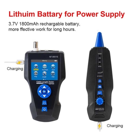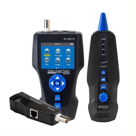 تستر کابل شبکه مدل NETPIL-NF 8601S با صفحه نمایش 2.8 اینچی LCD رنگی و محدوده اندازه گیری طول 10-2000 متر میباشد .قابلیت ردیابی کابل های STP/UTP Cat5e، Cat6، Cat6a، کابل شبکه Cat7، کابل تلفن، کابل کواکسیال و سیم‌های فلزی معمولی متصل به گیره تمساح را داشته و باتری لیتیومی 3.7 ولت / 1800 میلی آمپر ساعت در آن تعبیه شده است.از ویژگی های اصلی این محصول اتصال کوتاه، مدار باز، متقاطع، اتصال معکوس، اتصال زوج و محل قطع کابل کابل شبکه، خط تلفن، کابل BNC را آزمایش میکند و به طور مستقیم بر روی صفحه نمایش داده میشود. تست جفت باز، کوتاه، متقاطع و تقسیم برای کابل RJ11 RJ45 BNC و برای بررسی عیوب احتمالی مانند سرعت پایین شبکه، یک آزمایش تداخل بر روی کابل شبکه انجام میدهد و می توانید سیم هدف مورد نیاز خود را در میان بسیاری از کابل های شبکه، کابل های تلفن، کابل های کواکسیال و سایر کابل های فلزی مختلف پیدا کنید. اندازه گیری طول کابل های شبکه، کابل های کواکسیال و خطوط تلفن، تا 2000 متر قابل اندازه گیری است و دقت اندازه گیری طول کابل و محل قطع آن 98 درصد است. هنگامی که سوئیچ و روتر روشن هستند می تواند خط را پیدا کند. هنگامی که سوئیچ و روتر روشن هستند، می توان از عملکرد چشمک زن برای یافتن سریع کابل شبکه مورد نظر استفاده کرد. می تواند محل خاص نقطه شکست تک هسته ای و نقطه اتصال کوتاه کابل دو هسته ای را پیدا کند. و عملکرد صدای آداپتور هنگام اندازه گیری دنباله خط و تشخیص اسکناس و عملکرد نور، آسان برای کار در محیط تاریک از دیگر امتیازات این تستر میباشد.عملکرد ویژه محصول 1. سه حالت اسکن: حالت عادی، حالت POE، قدرت بالا.2. عملکرد POE: برای تشخیص اینکه کدام پین ها برق را تامین می کنند و همچنین تشخیص میزان ولتاژ.3. عملکرد PING: برای آزمایش عملکرد شبکه، بسته داده، حداقل و حداکثر زمان 4 بدون نویز ضد تداخل.5. TF
